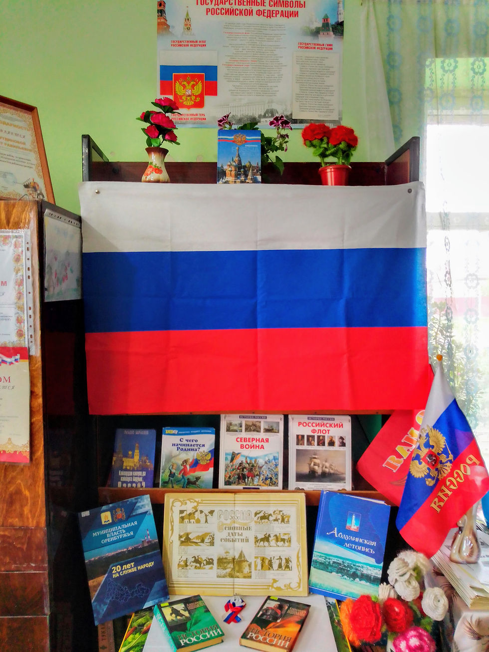 На ней представлена литература по истории нашего государства, а также книги о сегодняшнем дне страны. В оформлении выставки использованы государственные символы России: герб, флаг и текст гимна. В этот день библиотекарь Фахрутдинова Г.Р. провела с посетителями библиотеки беседу «России великая судьба».